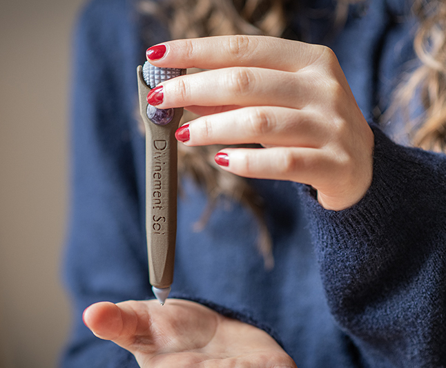 J’ai démarré avec la création d’une boule de massage pour les mains en 2023, réalisée grâce à une imprimante 3D et en matière végétale. Puis, avec mon compagnon, nous avons imaginé l’évolution de cette boule de massage dans les matières naturelles et les couleurs, puis la conception d’une balle anti-stress aux vertus thérapeutiques et d’un roller visage : le lithoroller. »